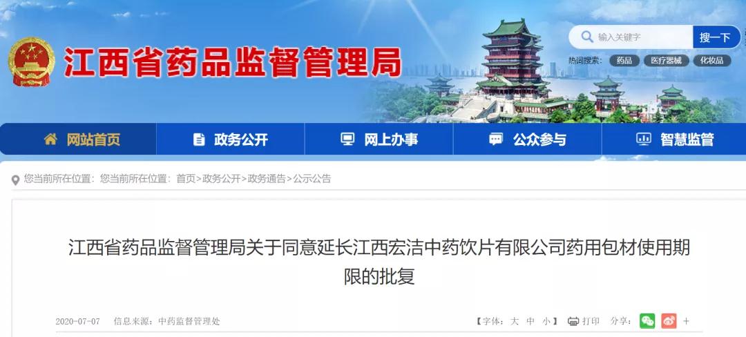 7月7日,江西省药品监督管理局,发布《关于同意延长江西宏洁中药饮片有限公司药用包材使用期限的批复》。