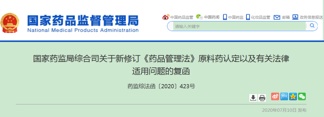 国家药监局综合司关于新修订《药品管理法》原料药认定以